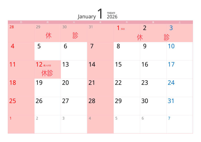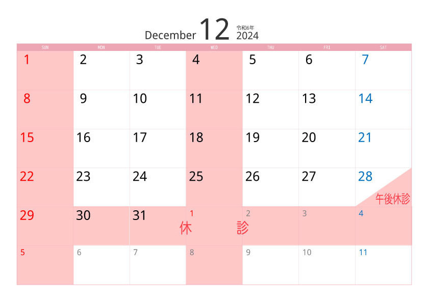 | 9:00〜12:30 (受付12:00まで) | 休 | ● | ● | 休 | ● | ● | ● |