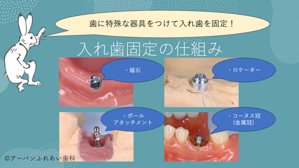 アタッチメントの例:磁石、ゴム、ボール状金属、樹脂、ロケーター、コーヌス冠・金属冠 (摩擦力)