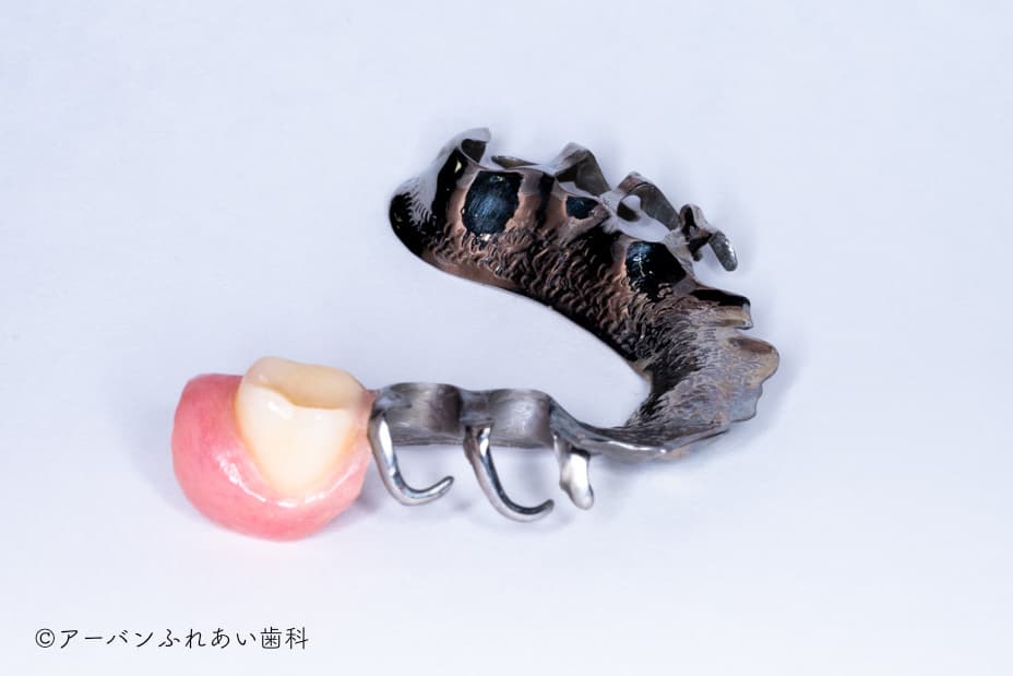 歯の部分は金属・セラミック・樹脂などから選択できます。例えば、金属の歯にすると歯がすり減らないので噛み合わせの高さを保つことができます。