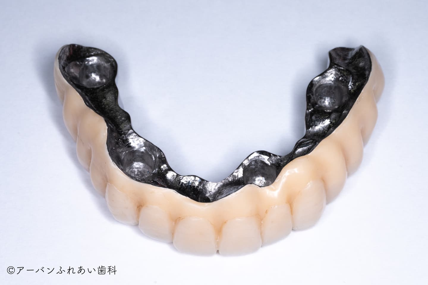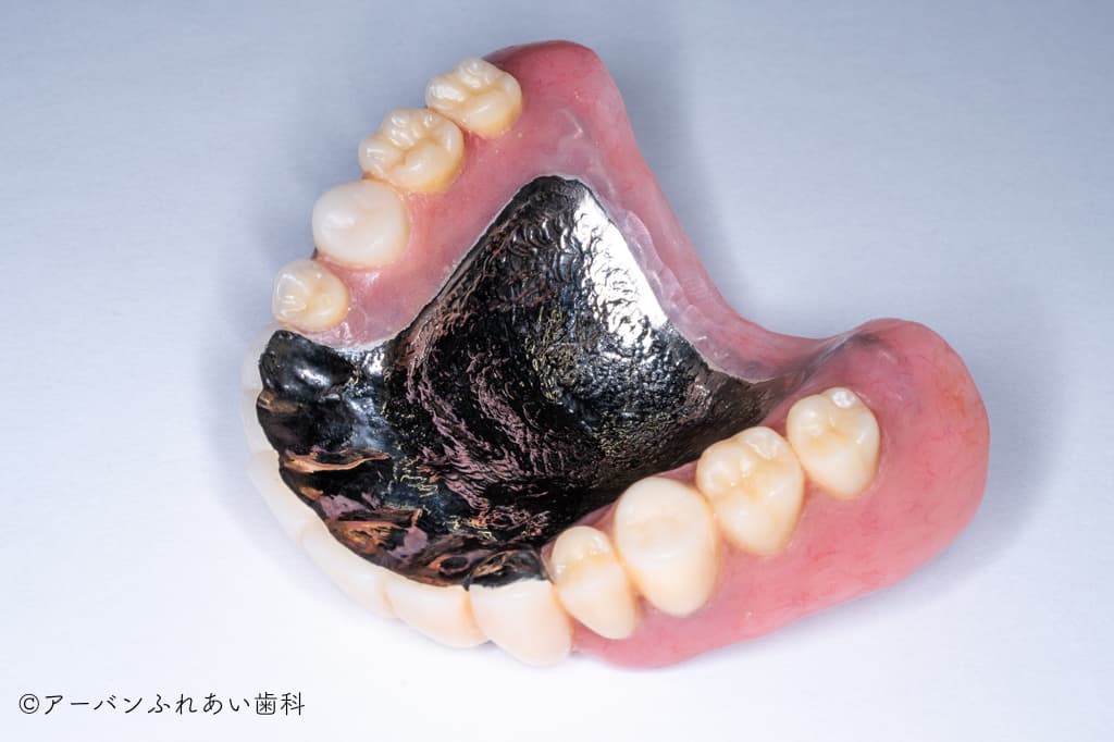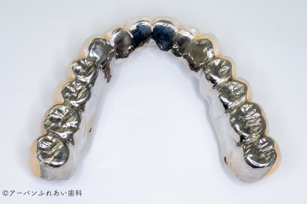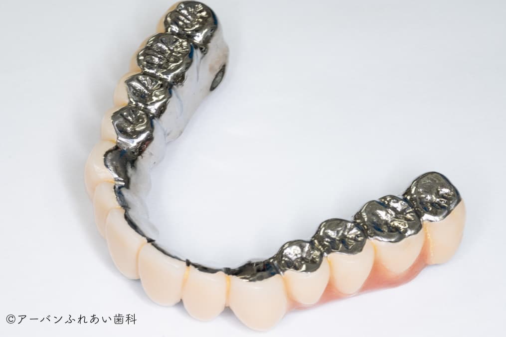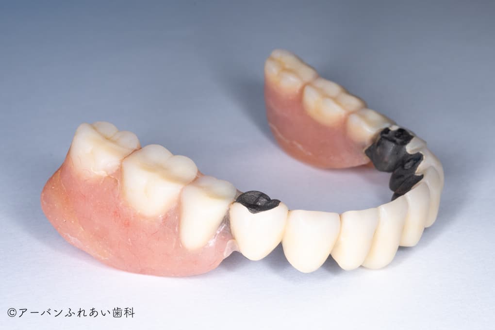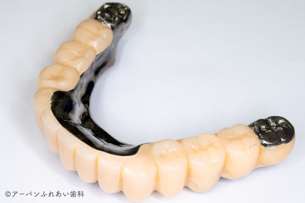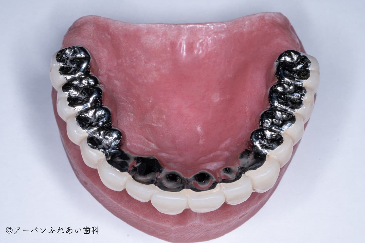 金属のフレームの上に樹脂・セラミックを盛り上げ、金属が見えないようにした入れ歯。