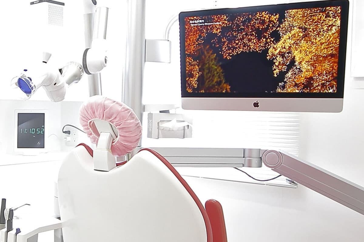診療室内の各チェアには大きなモニター・口腔内カメラ・口腔外バキュームを設置しています。座ったままの状態で患者さま自身の口腔内のお写真やレントゲンをお見せし、お口の状態についてインフォームドコンセントを行っています。通常は患者さまにリラックスしていただけるように四季折々の動画を流しています。当院では、1995年の開業当初から全てのチェアに口腔外バキュームを設置し、感染対策に加え、院内清潔に努めてきました。みなさまに安心して治療を受けていただけるようこれからも努力して参ります。